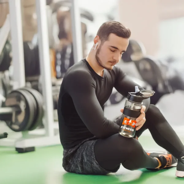 Eco-friendly Sports Bottles with Straw, 700ml, made from durable rPET material, are perfect for daily hydration needs. Featuring a transparent black body, secure push-button lid, comfortable silicon grip, and convenient straw, these bottles are reusable and sustainable. Ideal for gyms, outdoor activities, office use, and promotional giveaways across Dubai, Abu Dhabi, Sharjah, and the UAE.