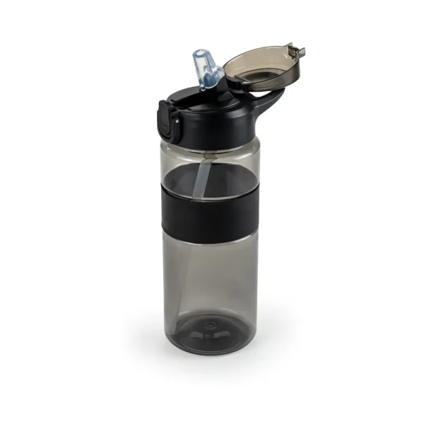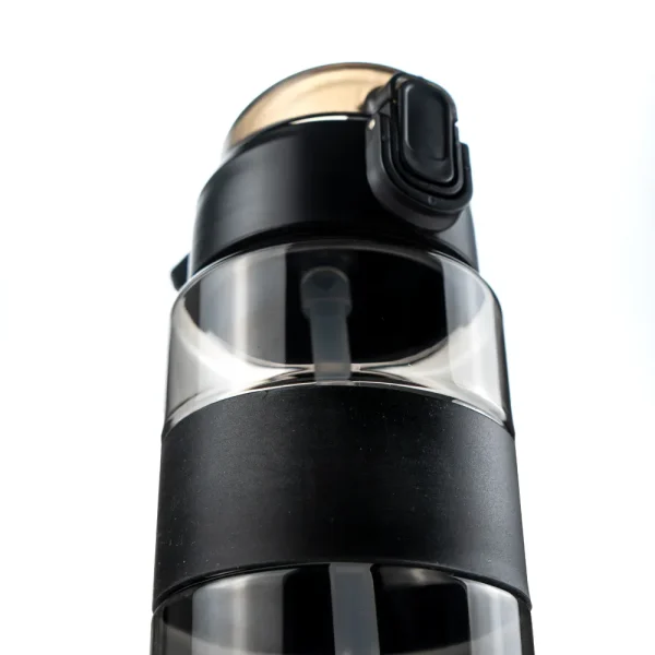 • Design: Transparent black bottle with straw, silicon grip, and push-button lid