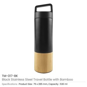 Travel Bottles with bamboo and in Black Matt SS, Matt design, and Twist off Lid with handle.